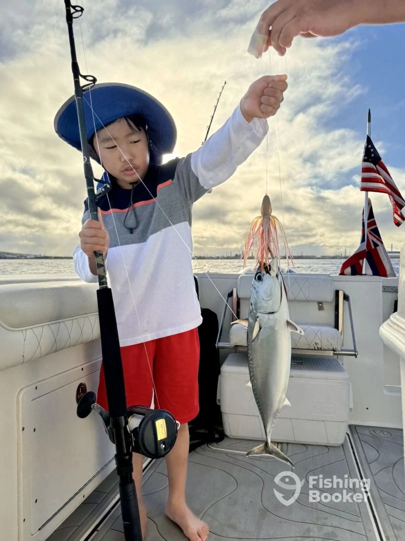 It was a calm morning perfect for light tackle trolling. We got lucky to have a few tug the line not far from our starting point. Great action to include some bottom fishing. A great start to the morning and epic fun for the keiki to hook, reel, catch and release these beautiful fish!