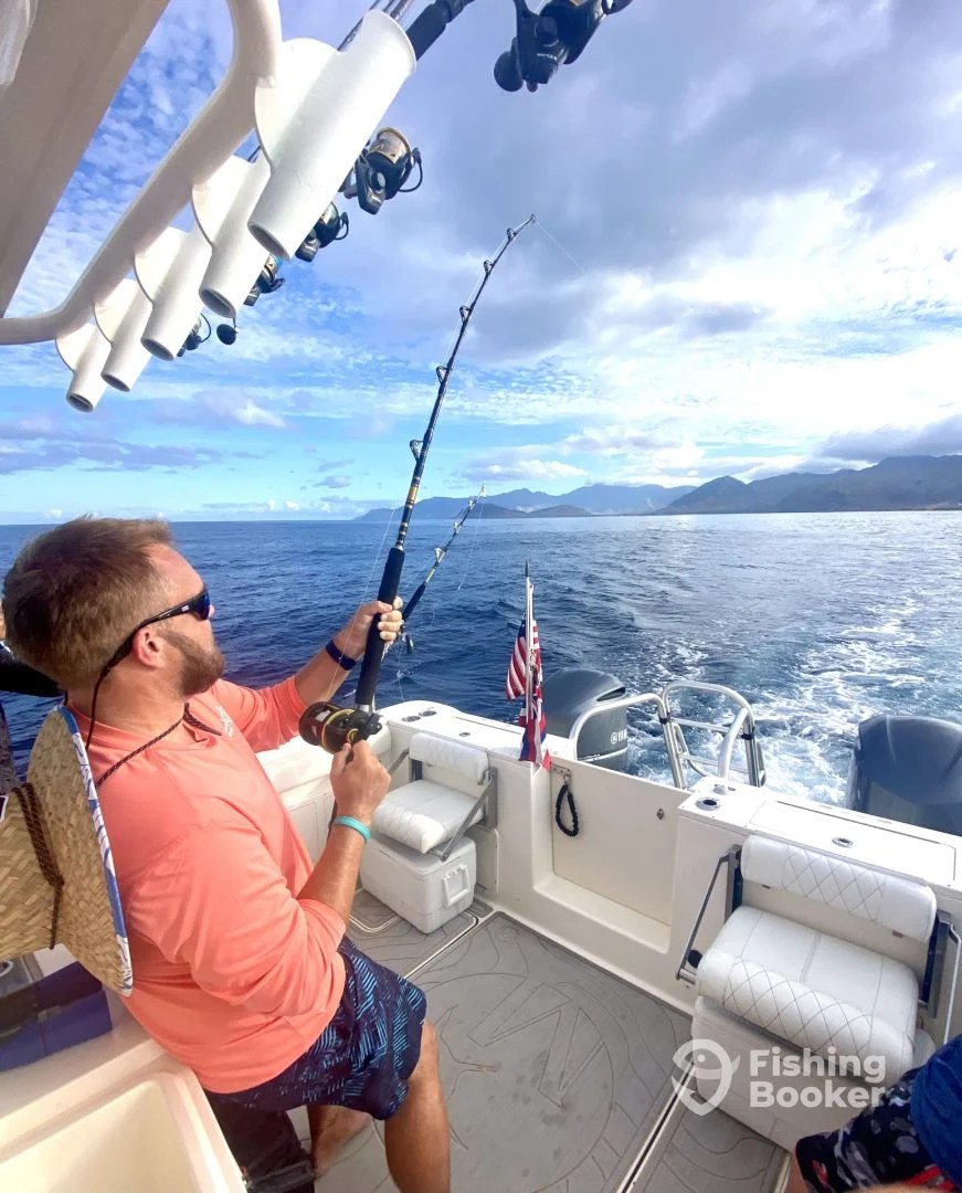 Fun morning charter from Ko Olina. We were a bit bummed after taking a solid bite and having the hook pull. That first bite went for a steady spool run of 15 seconds! SO much fun. Luckily, while setting the trolling lines back up, we got hit and landed this perfect sized Mahi. After some photos, we had some fun bottom fishing – landing some different variations of trigger fish. To end it all, we were greeted by a large pod of Pacific Bottlenose in about 200 fathoms of water!