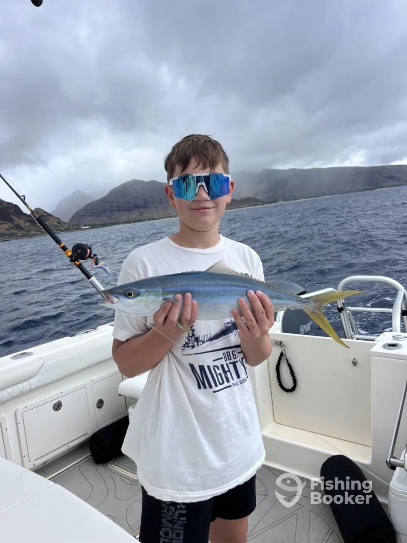 A little drizzly morning produced some fun fishing for the keiki! Started off with a small tuna followed by a nice fighting Rainbow Runner also known as a Kamanu! Coincidentally the rain produced some epic rainbows above us as well. Fun morning for all!